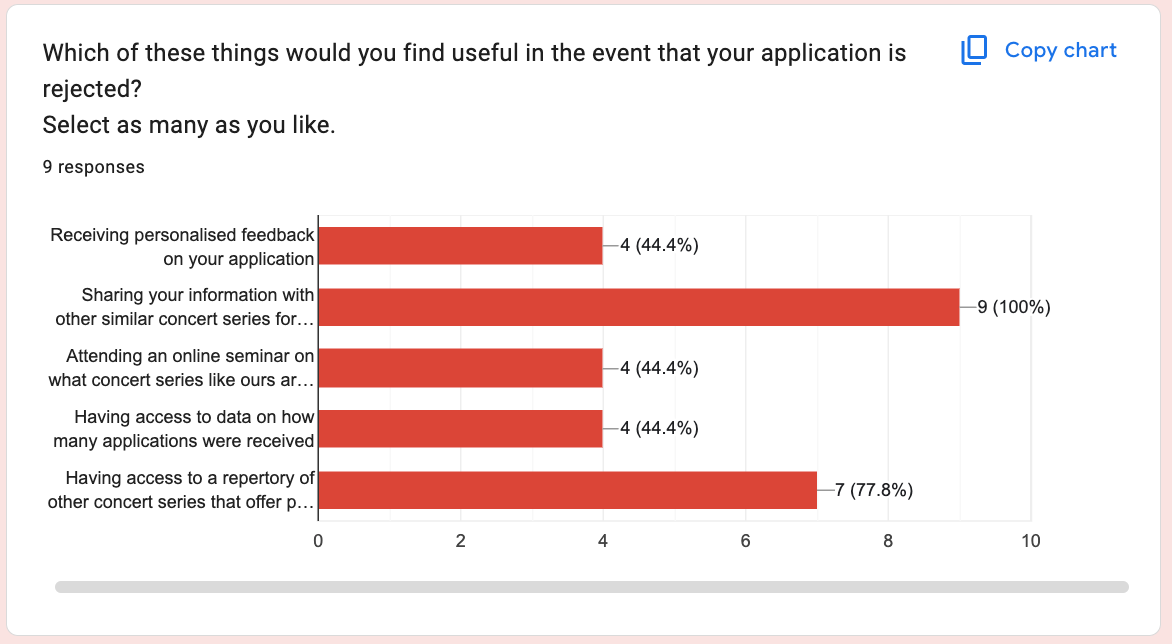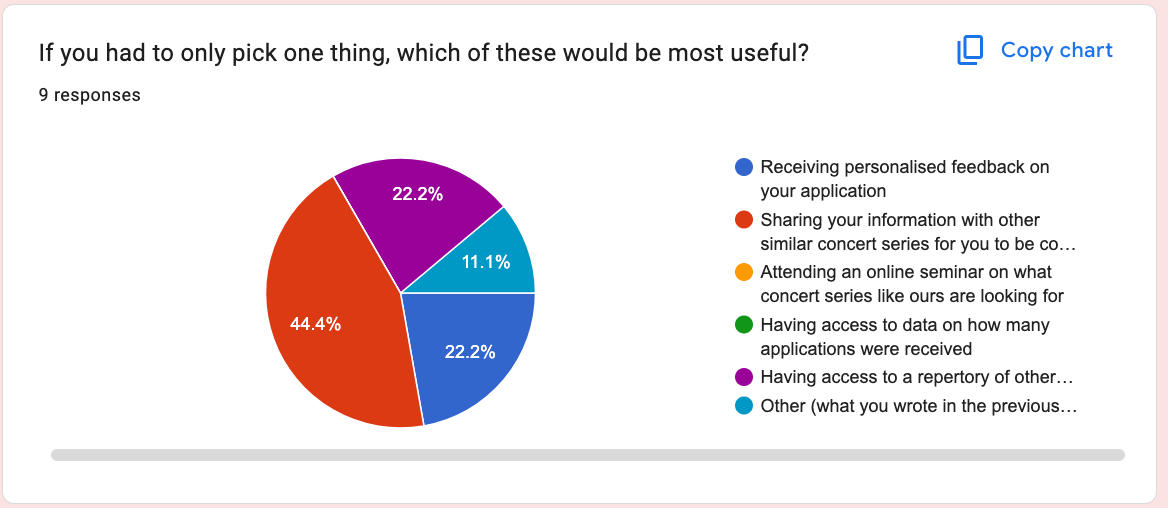 Whether it'd be sharing their details with other concert series, sharing a list of other paid performance opportunities, receiving individualised feedback, or a completely different idea, I gave them the opportunity to give me *their* side of the story. Because what you DON'T want to do as an organisation is to spend time and resources offering things that will make you look like you're doing something but that are actually irrelevant / not so useful to your target audience.